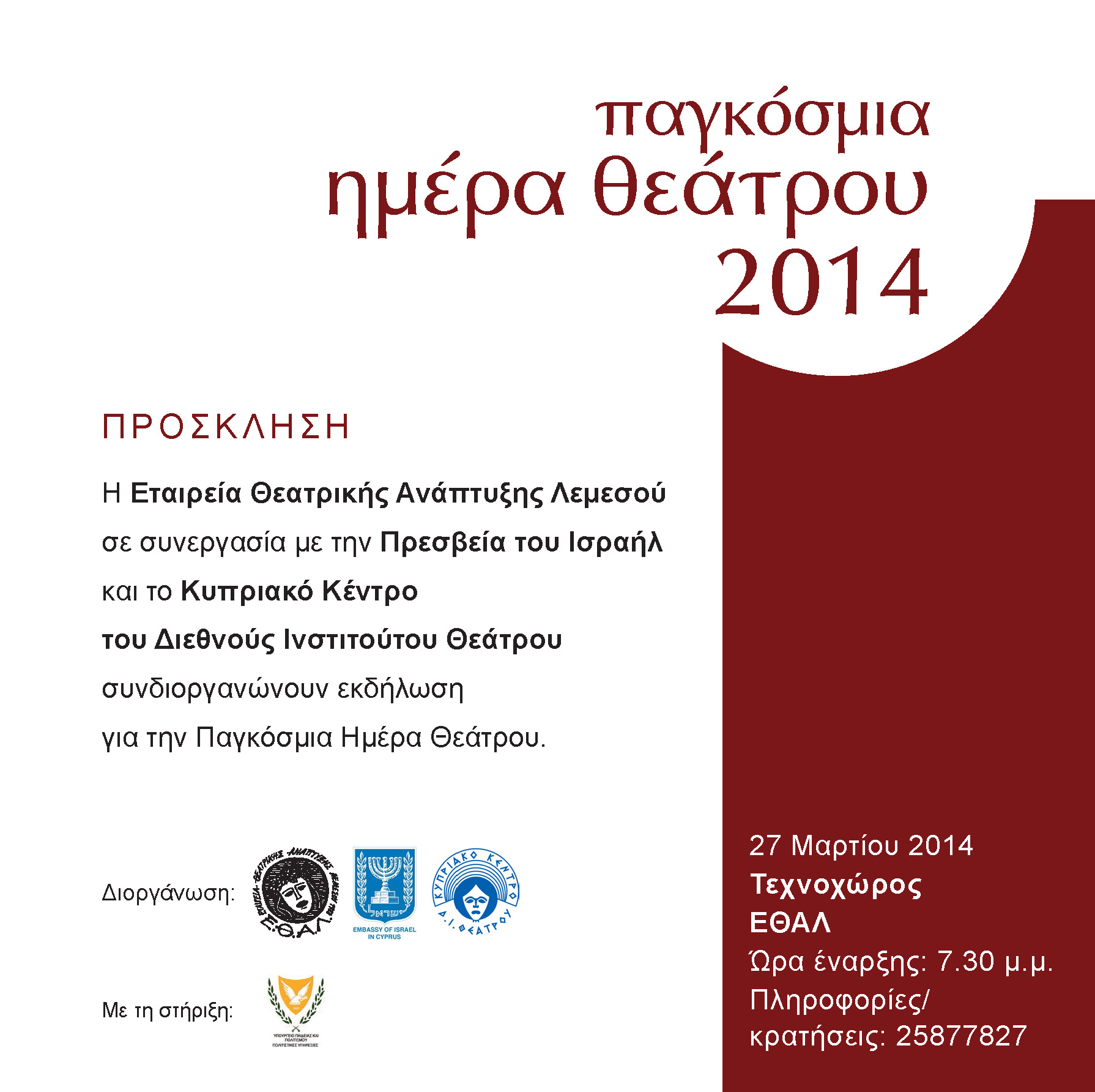 Εν όψει των εορτασμών για την Παγκόσμια Ημέρα Θεάτρου, 27 Μαρτίου 2014, τα Εθνικά Κέντρα και το Διεθνές Ινστιτούτο Θεάτρου ετοιμάζονται με ποικίλες εκδηλώσεις που θα διανθίσουν τον παγκόσμιο χάρτη, καλώντας το κοινό να συμμετάσχει σε αυτή τη διεθνή θεατρική γιορτή. Το Κυπριακό Κέντρο του Διεθνούς Ινστιτούτου Θεάτρου σε συνεργασία με την ΕΘΑΛ και την Πρεσβεία του Ισραήλ, αλλά και με τη στήριξη των Πολιτιστικών Υπηρεσιών του Υπουργείου Παιδείας και Πολιτισμού, συνδιοργανώνει στις 27 Μαρτίου 2014 εκδήλωση στον Τεχνοχώρο της ΕΘΑΛ.