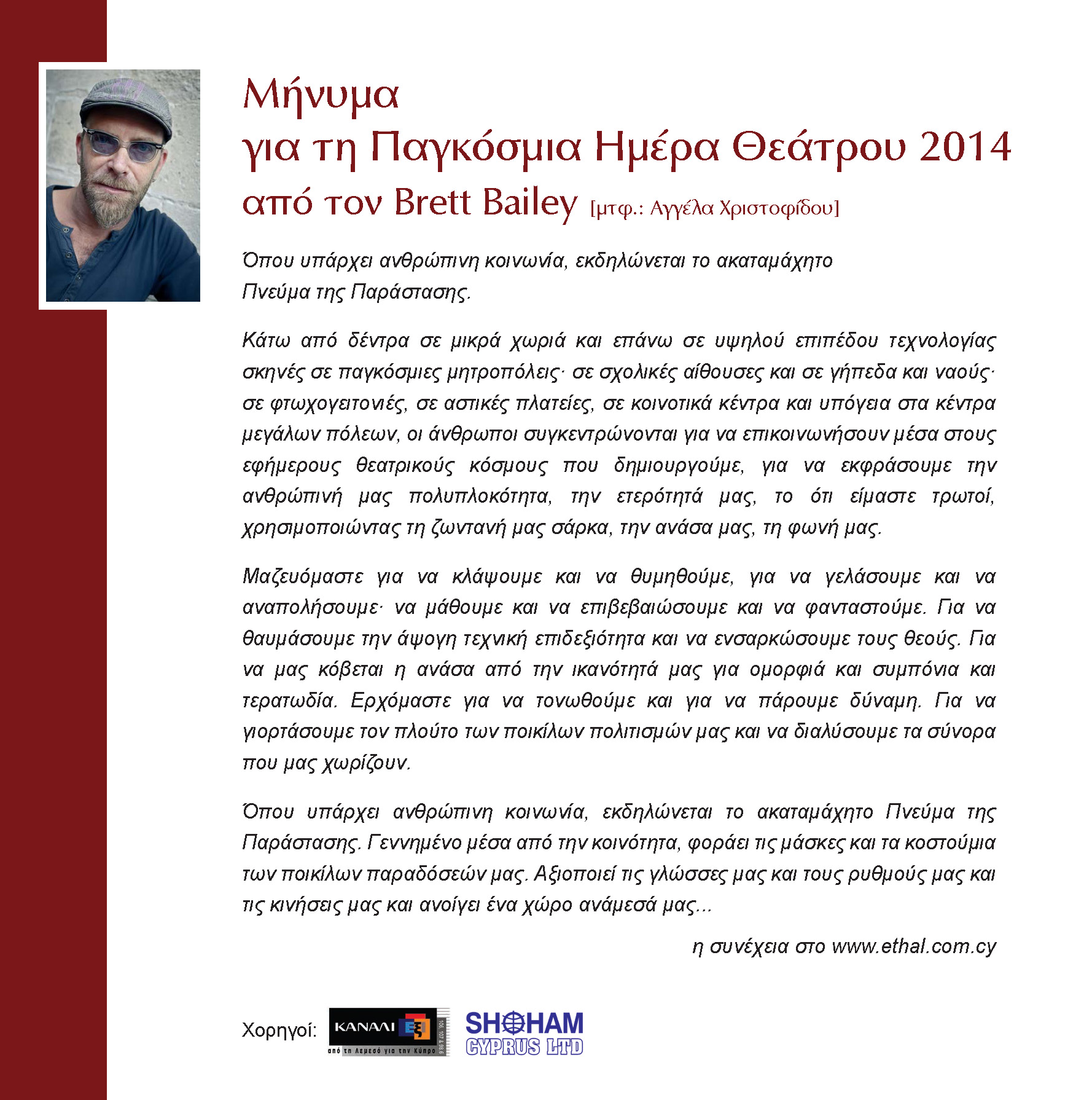 Ο Νοτιοαφρικανικής καταγωγής θεατρικός συγγραφέας, σχεδιαστής, σκηνοθέτης, δημιουργός θεατρικών παραστάσεων με κατασκευές και καλλιτεχνικός διευθυντής του THIRD WORLD BUNFIGHT, Brett Bailey, έγραψε φέτος το Μήνυμα της Παγκόσμιας Ημέρας Θεάτρου. Από τον Ζαν Κοκτώ έως τον Άρθουρ Μίλλερ, περνώντας από τον Πήτερ Μπρουκ στον Ευγένιο Ιονέσκο, από τον Ιάκωβο Καμπανέλλη στην Αριάν Μνουσκίν, από τον Αουγκούστο Μποάλ στον Ντάριο Φο, οι καλύτεροι θεατρικοί καλλιτέχνες έγιναν μέρος των εορτασμών για την Παγκόσμια Ημέρα Θεάτρου από το 1962 έως σήμερα.