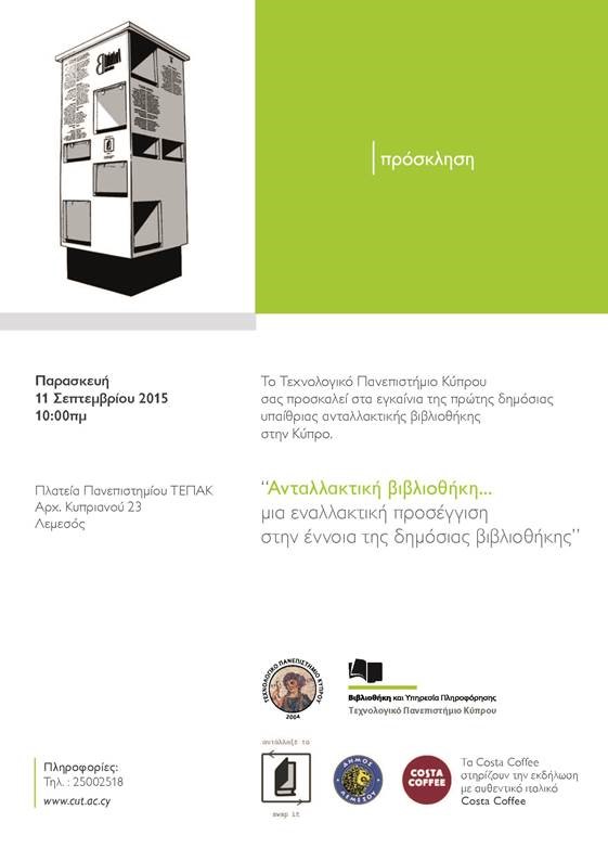Το Τεχνολογικό Πανεπιστήμιο Κύπρου διοργανώνει εκδήλωση εγκαινίων της 1ης Παγκύπριας δημόσιας δωρεάν ανταλλακτικής βιβλιοθήκης την Παρασκευή 11 Σεπτεμβρίου 2015 στις 10:00. (επισυνάπτεται πρόσκληση) Την εκδήλωση στηρίζουν με αυθεντικό ιταλικό καφέ τα Costa Coffee. Κατά την τελετή εγκαινίων το κοινό θα έχει την ευκαιρία να μιλήσει με τους αρχιτέκτονες και καλείται να γεμίσει τη βιβλιοθήκη με βιβλία από την προσωπική του συλλογή.